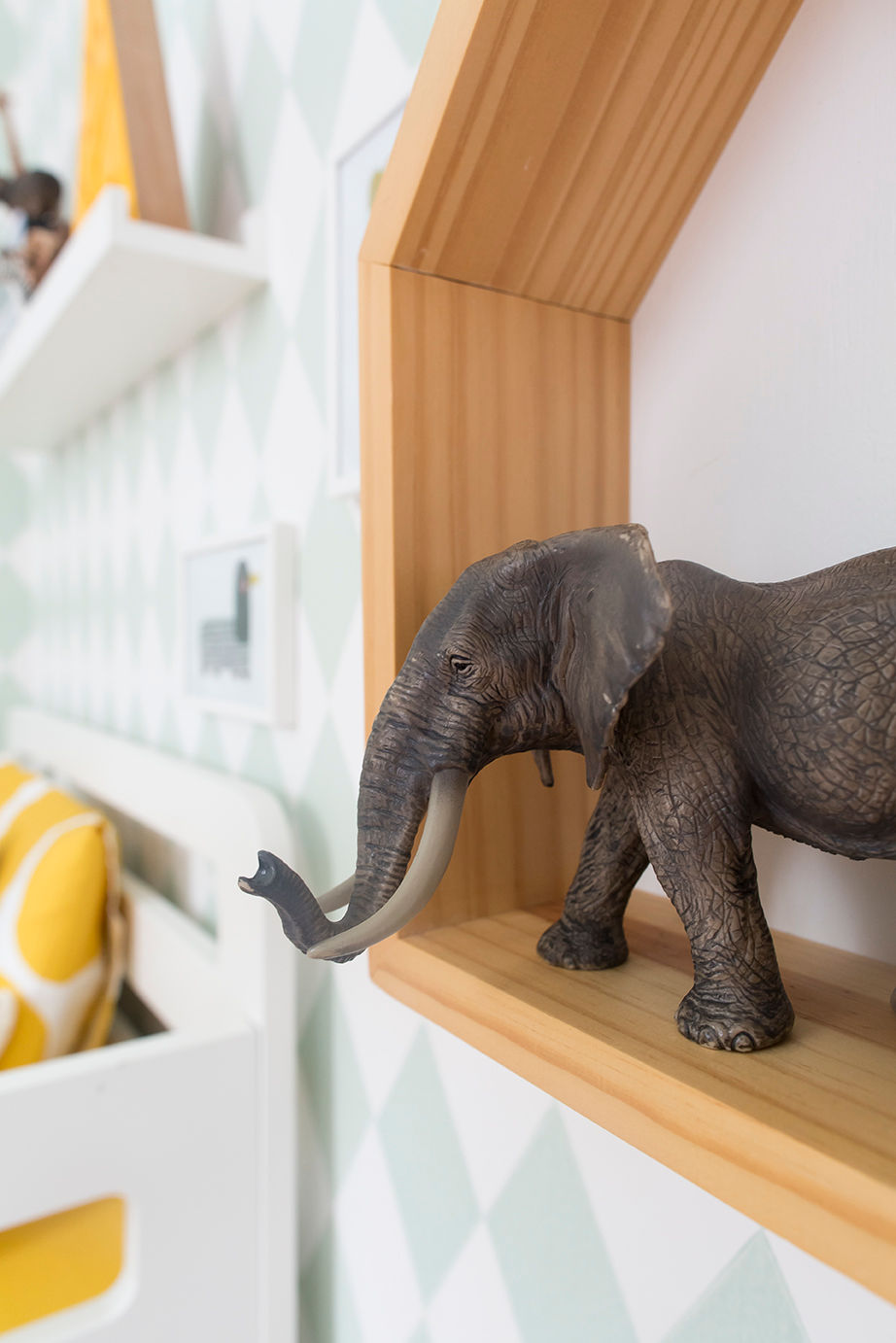 Além da beleza, o que eu mais amo desse projeto: a mãe fez tudo sozinha! Só teve ajuda de fora para instalar o papel de parede e pregar coisas na parede. O restante todo, ela que pesquisou, escolheu e compôs. Ela inclusive pintou a parede e fez a porta de maternidade (sim, ela pintou os bonecos, fez as bandeirolas, colou etc). Não é muito amor?