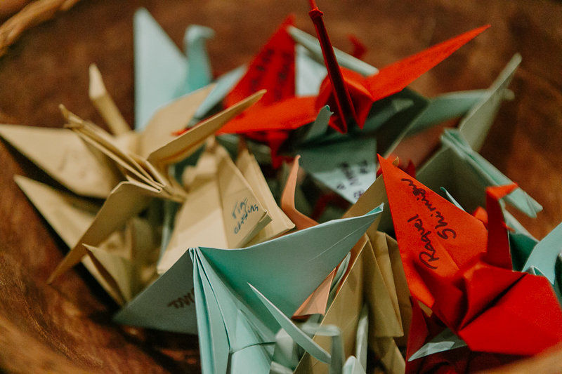 E como a inspiração da ilustração partiu de passarinhos, a mãe contratou uma oficina de origami para que os convidados fizessem tsurus com mensagens para o Theo. Esses tsurus viraram um móbile que foi para o quartinho dele! Aproveitei e coloquei muitos tsurus na decoração também. Adorei o resultado com tons diferentes e que se integraram muito bem às cores da casa.